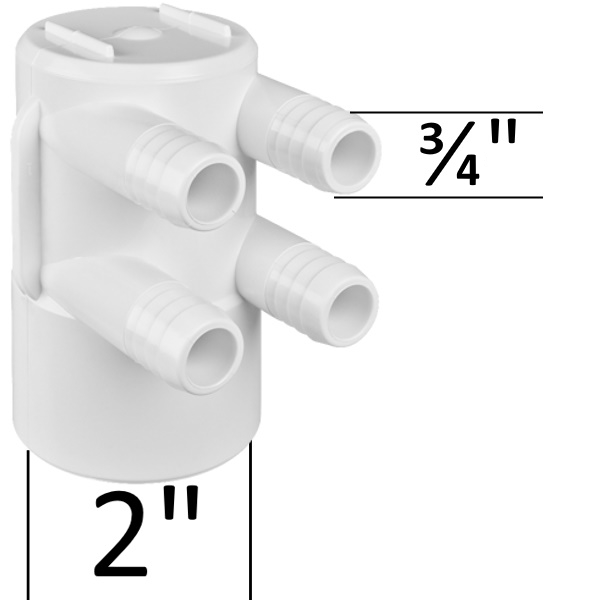 Fördelare med ändplugg 2″ (ca. 60mm) invändig med pluggad ände 4 portar 3/4″ (ca. 27mm)